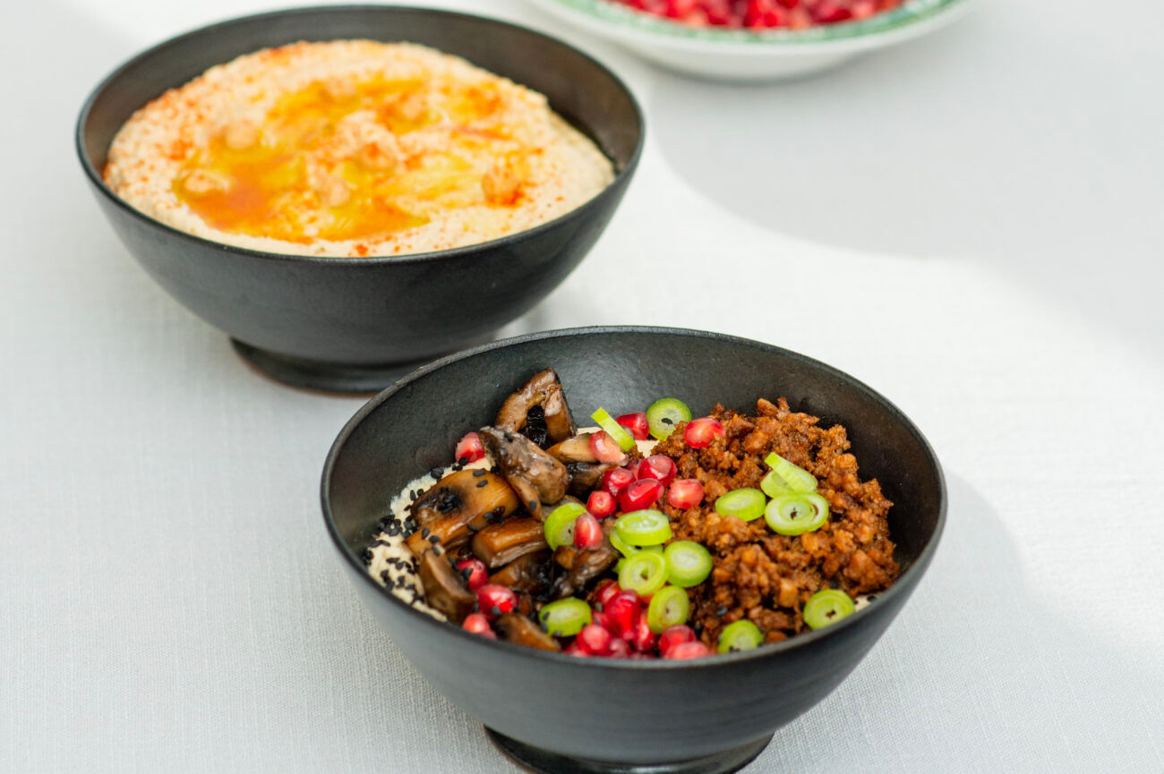 Lägg upp humus som en bas i en skål och toppa med svamp och färs. Servera med granatäpplekärnor, libabröd, pickles och rostade sesamfrön.