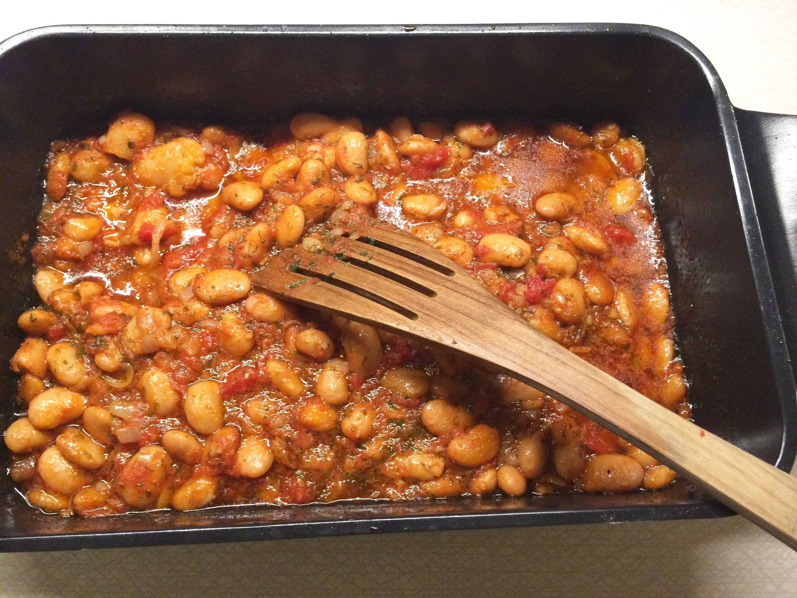 Så fort sommaren är på intåg längtar jag efter grekisk mat, det är liksom en regel. Och inte bara tzatziki, utan också såna här ljuvligt goda stora vita bönor med fin olivolja som får puttra ihop i ugnen. Rätten blir härligt krämig och passar bäst att doppa en bit bröd i.