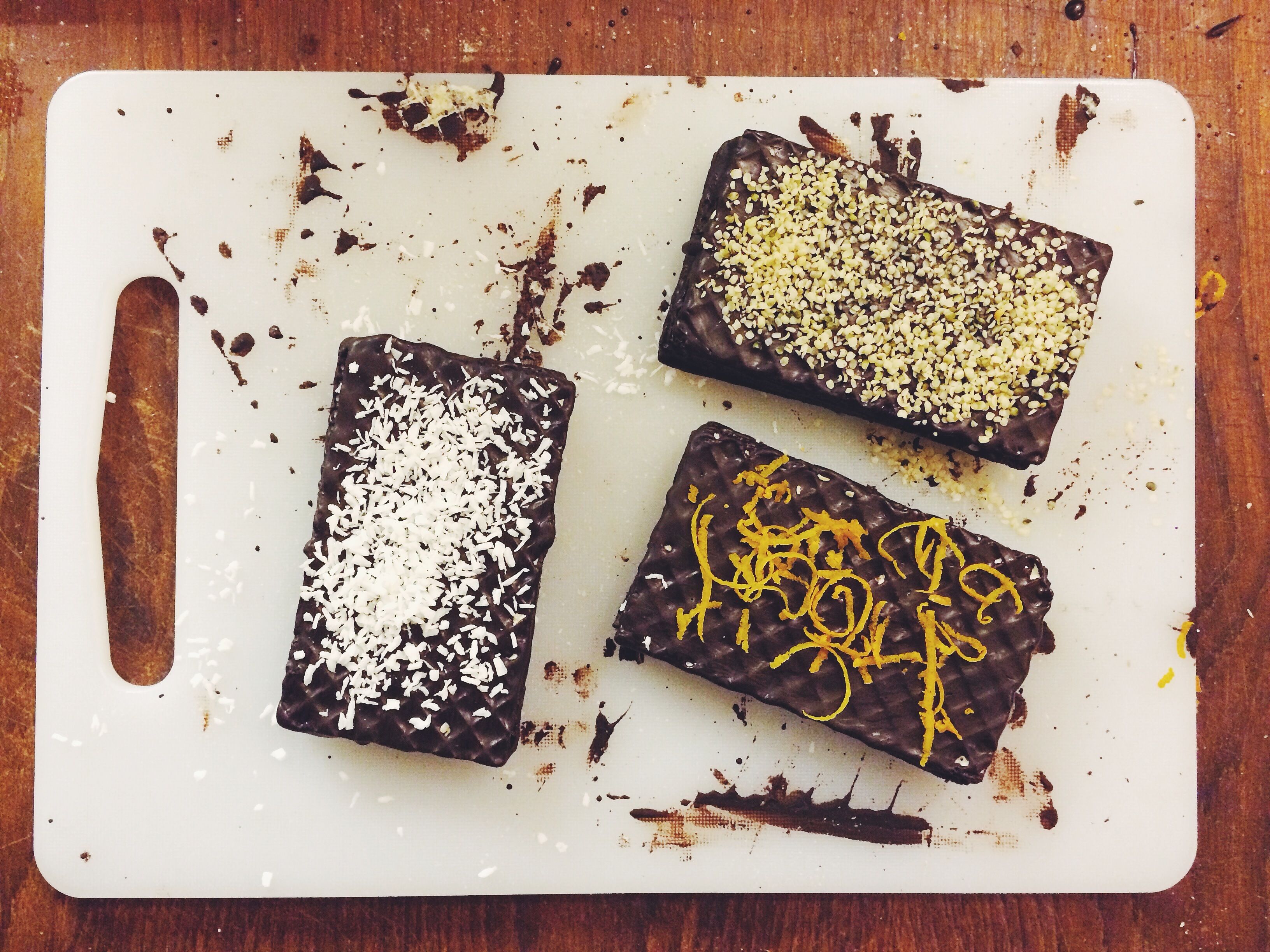 - Pensla sedan ovansidan med choklad och lägg på toppingen. Jag provade rivet apelsinskal, riven cocos och hampafrö.